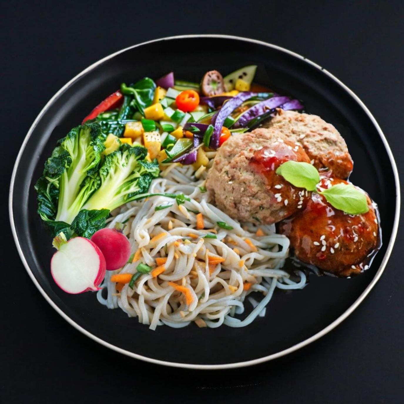 ~Side: SWEET POTATO NOODLES~ Savor the rich flavors of our Asian Vegan Beef Meatballs, providing a delicious and wholesome meal to satisfy and nourish your body.