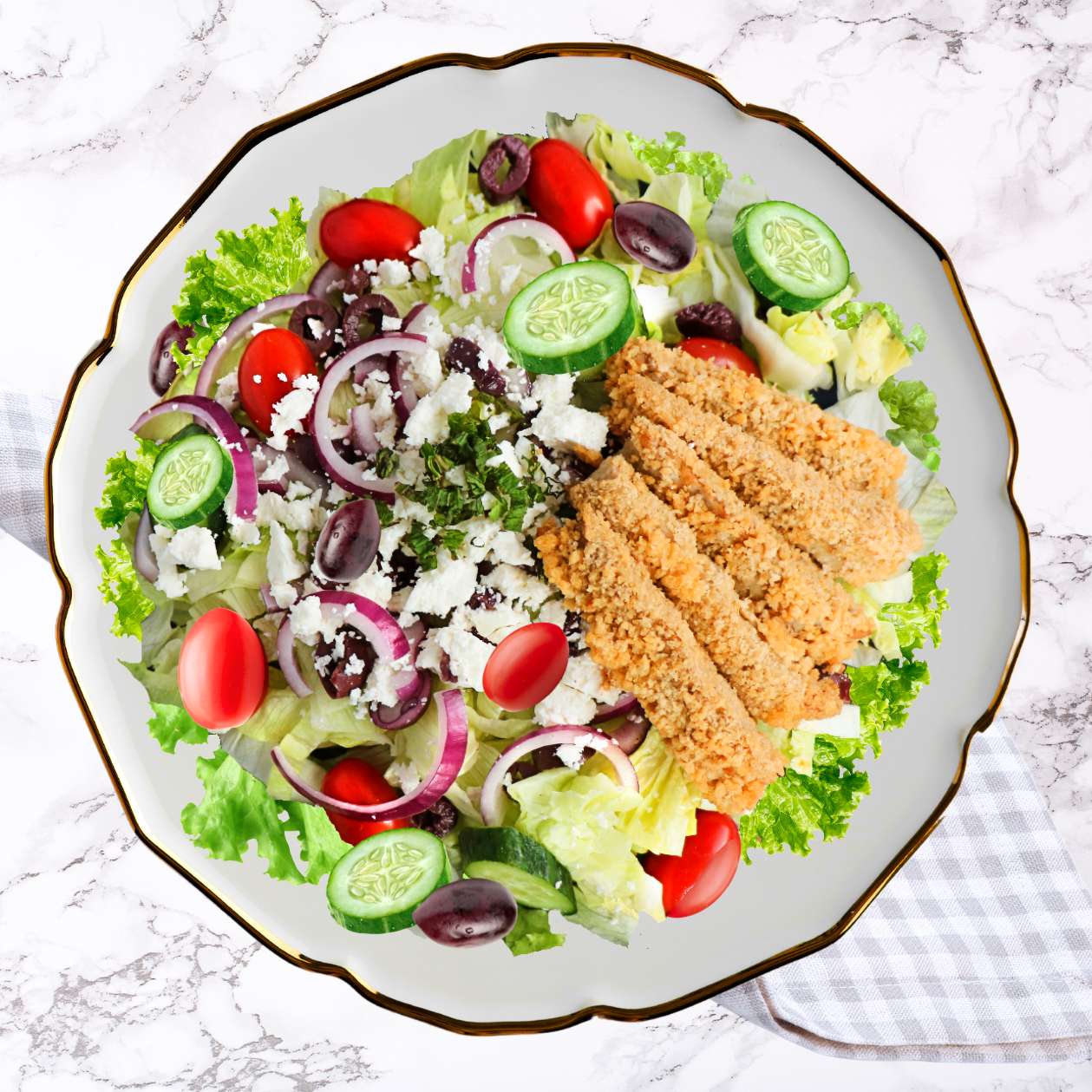 Experience the Mediterranean in a bowl with our Vegan Greek Salad, a tantalizing mix of fresh vegetables, Kalamata olives, vegan feta cheese, and zesty Greek dressing.