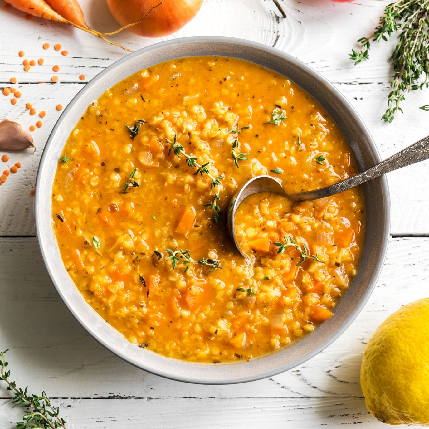 Dive into a power bowl of Red Lentil Soup, packed with protein and fiber in a rich, warmly spiced broth topped with plant-based parmesan for a complete and satisfying vegan meal.