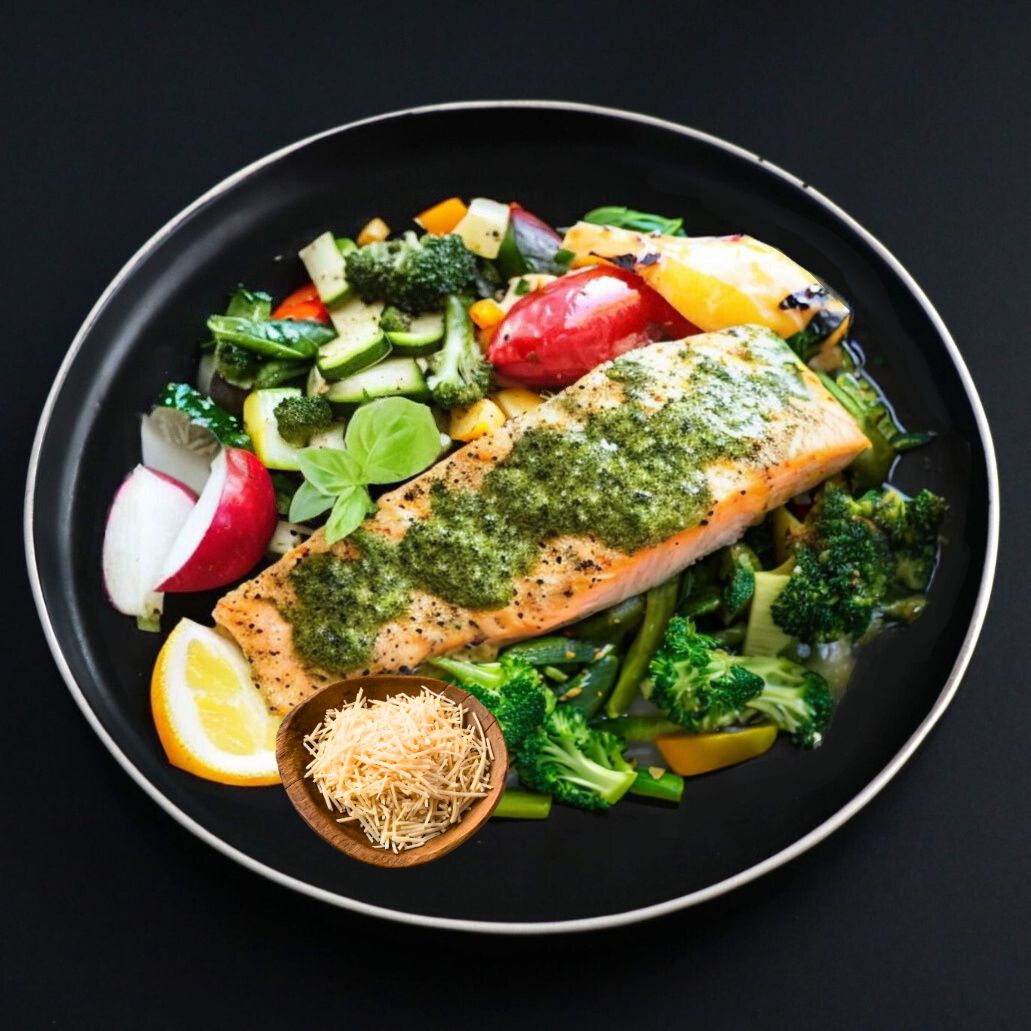~Side: VEGGIES~ Savor the delicate taste of perfectly baked Atlantic salmon drizzled with fresh aromatic Pesto bouquet of Italian herbs to add a burst of flavor to every bite.