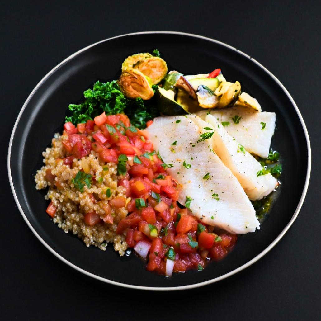 ~Side: QUINOA~ Tender Cod fillet is smothered in lemon garlic buttery sauce topped with a briny Bruschetta. So fresh and summery!