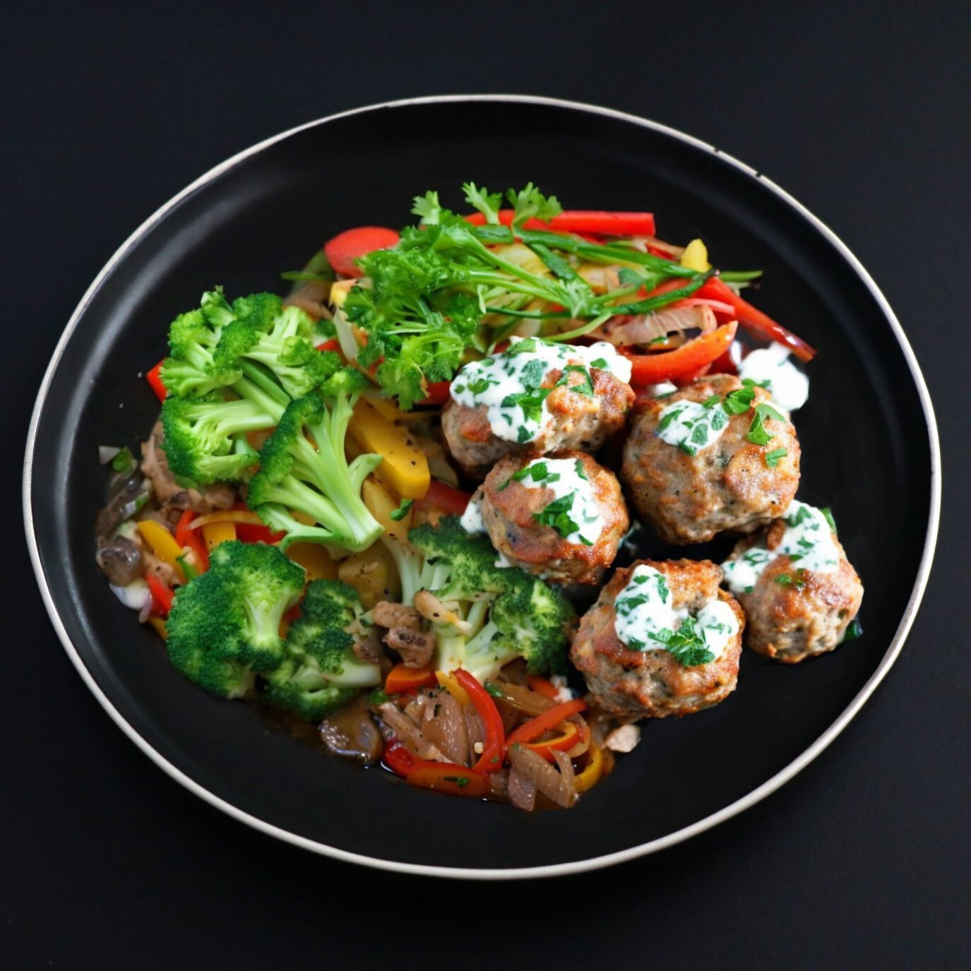 Ground lean Turkey (Halal); onion, garlic, oregano, parsley, spear mint, black pepper, olive oil, eggs, zucchini, salt; pressed yoghurt, garlic, salt, cucumber