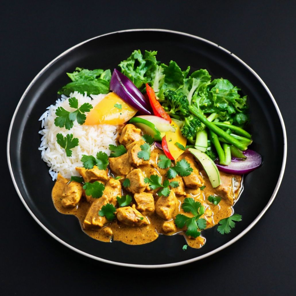 Chicken thighs (Halal); coconut milk, ginger, garlic, garam marsala, red chili powder, salt, olive oil, cardamom, onion, coriander.