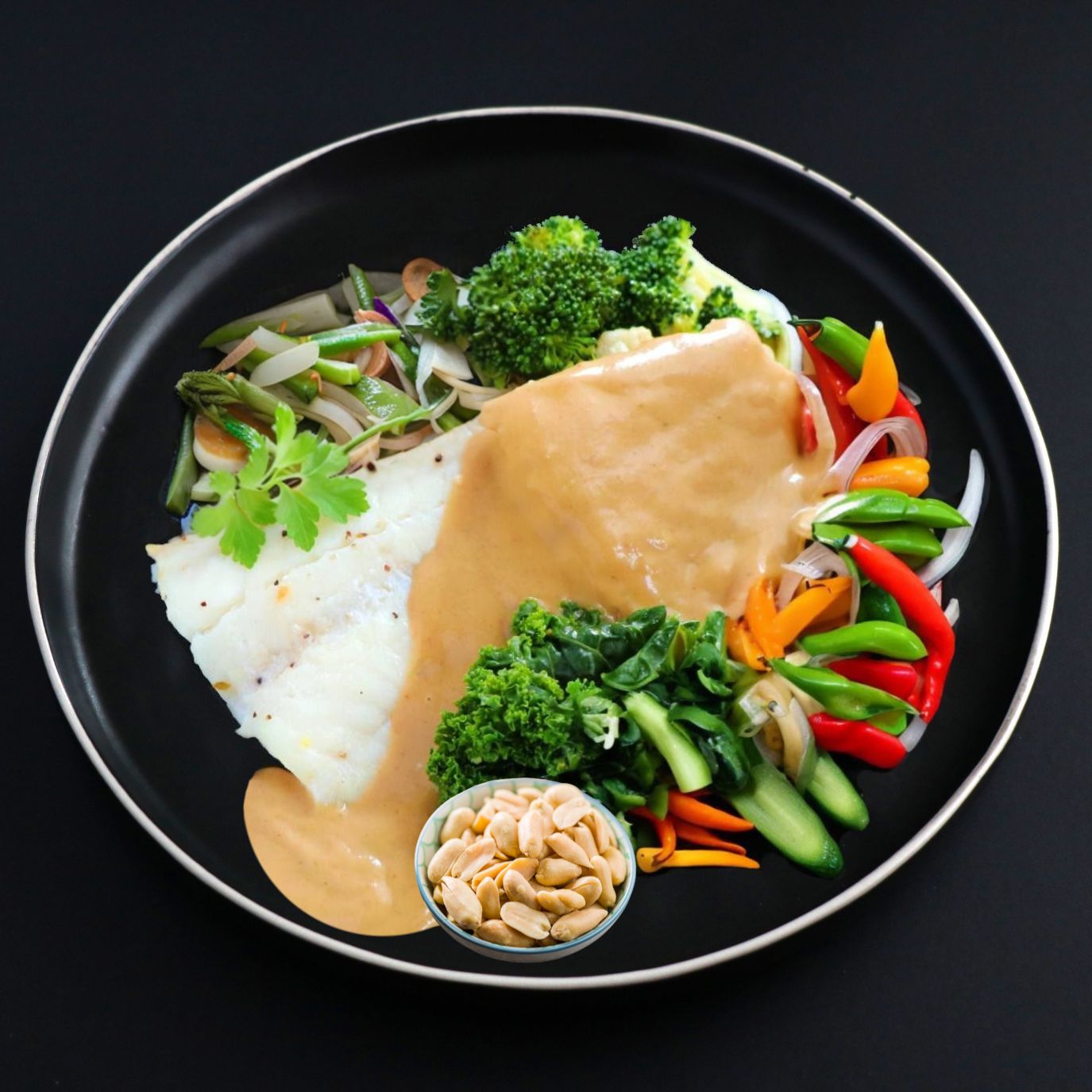 ~Topped with: ROASTED PEANUTS~ Indulge in flaky Cod fillet simmered in a luscious, spiced Peanut Curry sauce, blending rich, nutty depth with aromatic spices for a bold and satisfying bite.