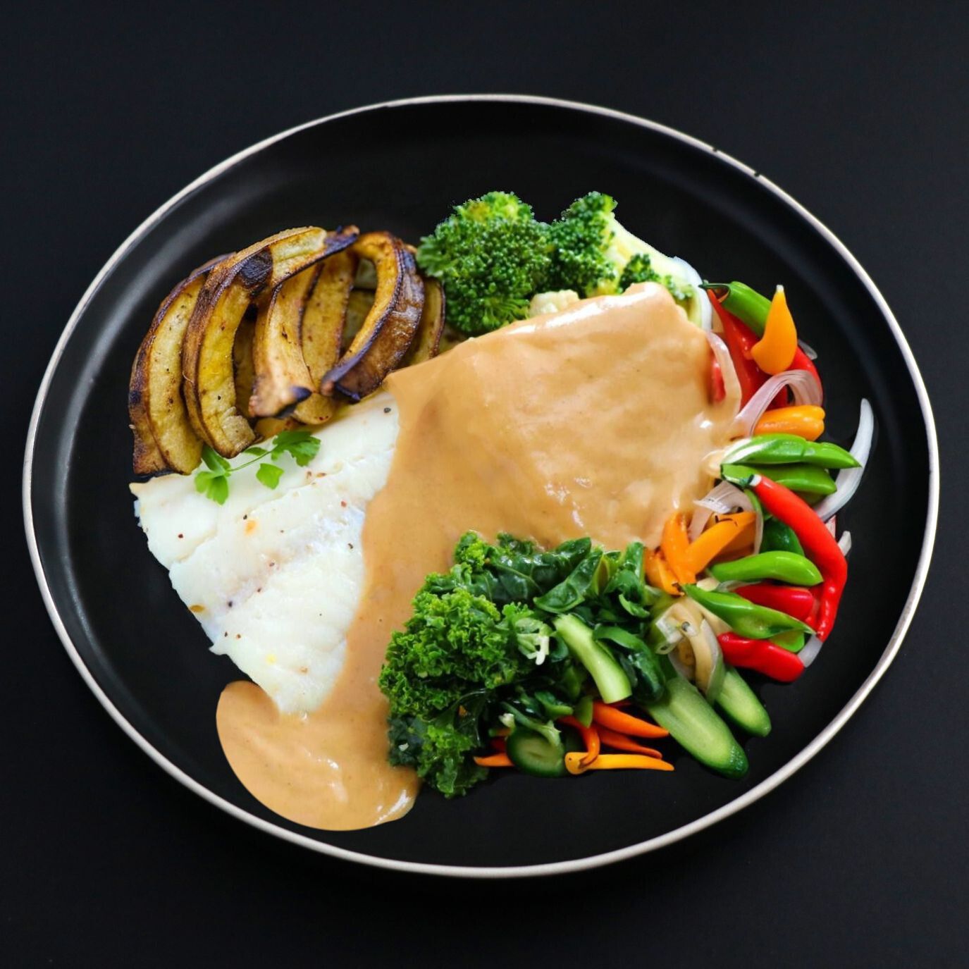 ~Side: ROASTED PLANTAIN~ Indulge in flaky Cod fillet simmered in a luscious, spiced Peanut Curry sauce, blending rich, nutty depth with aromatic spices for a bold and satisfying bite.