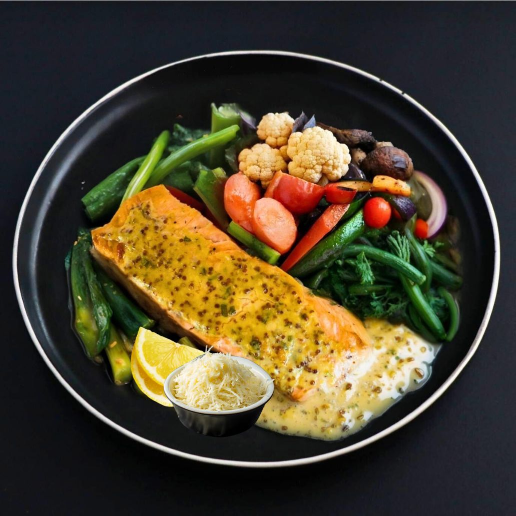 ~Topped with: PARMESAN/side assorted veggies~ Oven-roasted Salmon glazed with a zesty Lemon Dijon sauce - bright, tangy, and packed with flavour in every bite.