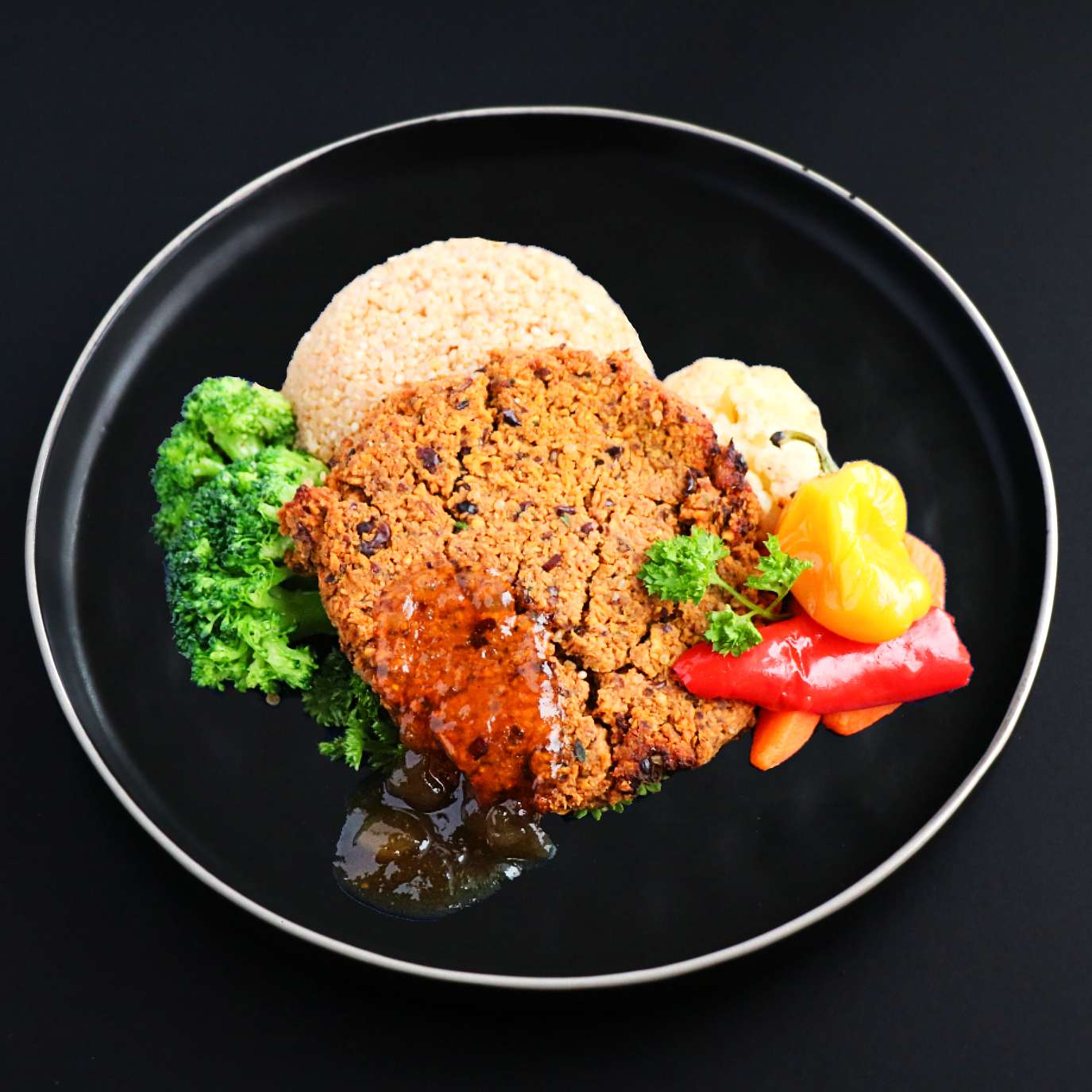 ~Side: QUINOA~ Check out the wholesome goodness of our homemade vegan slider in an adventurous flavour duet with mango chutney! Sided with assorted veggies.
