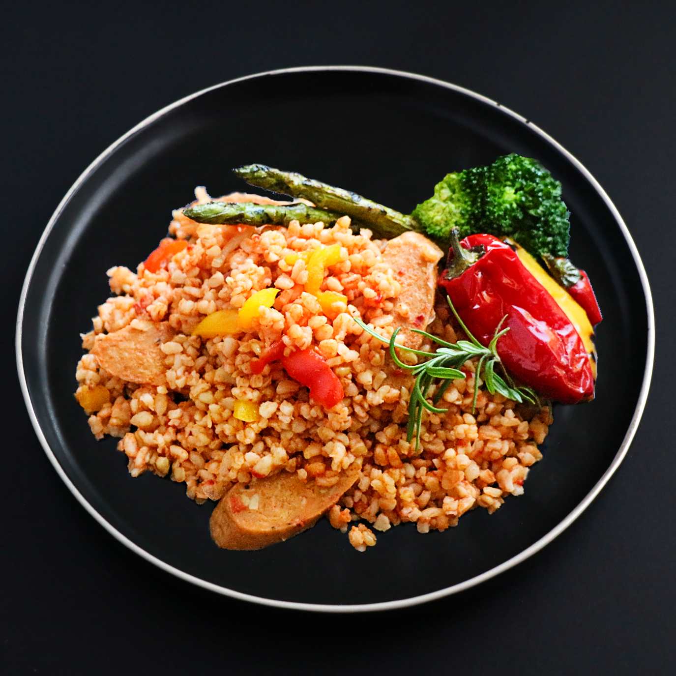 Experience the bold and hearty flavors of this nutritious and delectable dish that combines spicy, plant-based chorizo with wholesome bulgur for a satisfying meal.